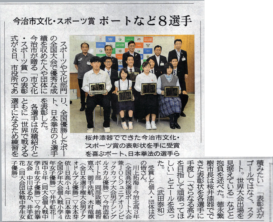 | (1)情報: 今治市長 徳永 繁樹 様 受賞者 〇川上 拓海さん(高3) 第33回全国高等学校選抜ボート大会男子シングルカル優勝 〇今治造船ボート部 木村 竜暉さん 越智 寛太さん 岡部 政憲さん 御手洗 航さん 第100回全日本選手権大会男子クォドルプル優勝 〇水本 芽衣さん(小4) 第3回日本拳法全国少年大会・個人戦 優勝 〇井手 虹花さん(中3) 第3回日本拳法全国少年大会・個人戦 優勝 〇今治拳友会 井手 虹花さん(中3) 中川はるかさん(中2) 第18回日本拳法全国少年大会・団体戦 優勝 |