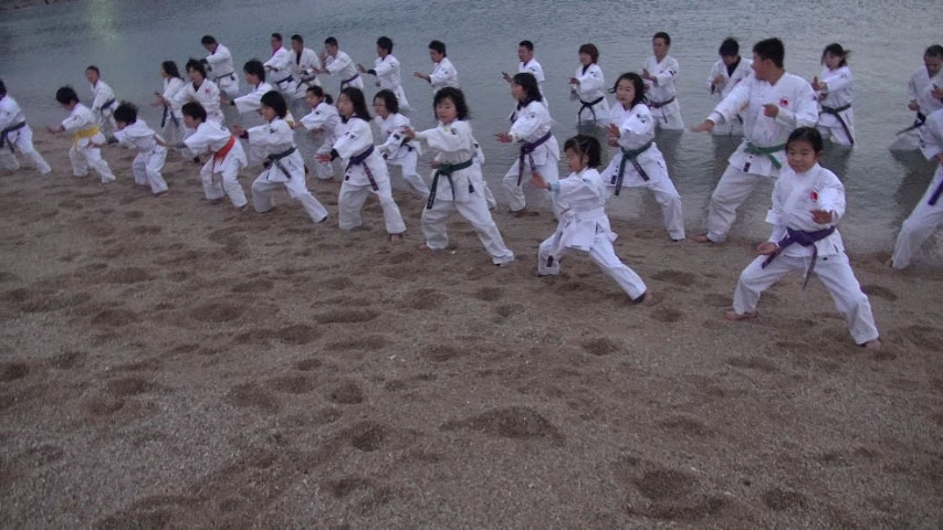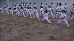 寒稽古は今治拳友会が3年前から実施。1日は日の出前の午前6時すぎ、道場生たちが砂浜を20分ほど走った後、はだしになって稽古を開始。掛け声に合わせ、突きや蹴りなどを繰り出していた。