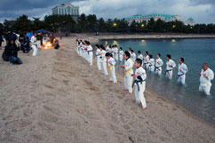 道場生は辺りが真っ暗な午前6時すぎから砂浜をランニング。はだしになって、突きや蹴りの基本動作を繰り返した。
