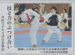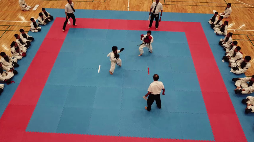 東日本大震災時の支援を機に県連盟と交流する宮城県の気仙沼道場の5人も出場し、選手は3本勝負で熱戦を展開。小学4年の部を制した今治拳友会の井手虹花さん(10)は「頑張って結果を出せてうれしい。大会を通じて仲間が増え、国体の正式種目になれば」と語った。