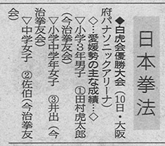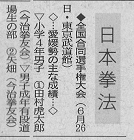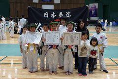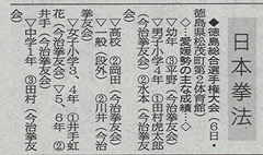 | 今治拳友会 【小学4年生】優 勝 田村 虎太郎 【小学3年生】優 勝 井手 虹花 【幼 年】 凖優勝 平野 生真 今治拳友会岩国 【高校生男子】三 位 岡田 郁輝 【小学1年生】 敢闘賞 本城 彰人 その他の成績 ▽小学4年生 (ベスト8) 中川 英明 (ベスト8) 園畠 聡一朗 (岩国支部) ▽小学5年生 (ベスト8) 亀田 蒼良 (岩国支部) 【一般男子段外】 (ベスト16) 平野 航太 |