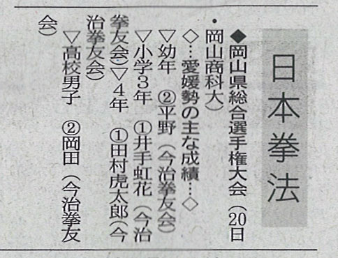 | 今治拳友会 【小学4年男子】 優 勝 田村 虎太郎 準優勝 水本 康太 【小学5・6年女子】 準優勝 井出 七星 【小学3・4年女子】 優 勝 井手 虹花 【幼 年】 三 位 平野 生真 【中学1年女子】 準優勝 田村 百萌 【一般男子(段外)】準優勝 川井 勝成 今治拳友会岩国 【高校男子】準優勝 岡田 郁輝 |