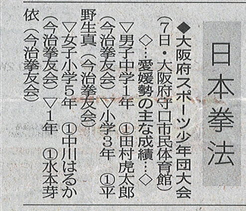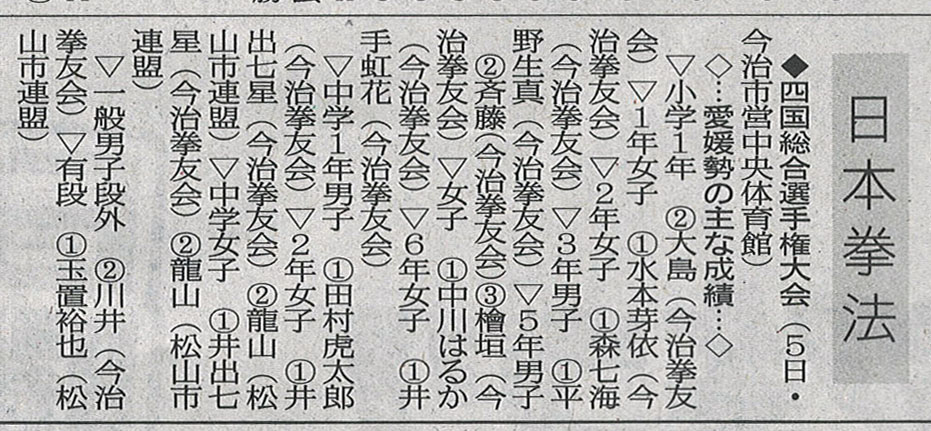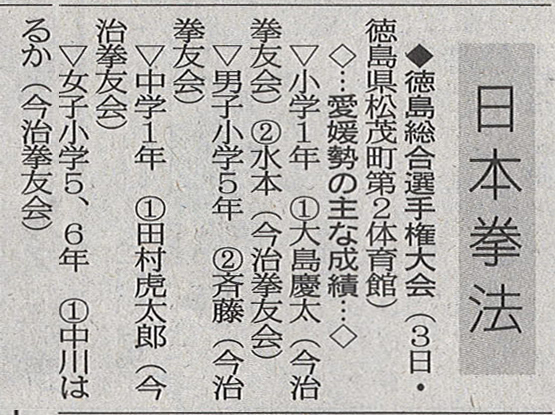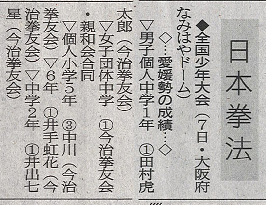 | 今治拳友会 【中学1年男子】優 勝 田村 虎太郎 【小学5・6年女子】優 勝 中川 はるか 【小学1年】優 勝 大島 慶太 準優勝 水本 芽依 【小学5年男子】準優勝 齊藤 俊彰 その他の成績 【小学4年男子】ベスト4 堀田 晃誠 今治拳友会岩国 【一般男子段外】優 勝 澤村 優雅(高2) 【高校生男子】準優勝 澤村 優雅(高2) 【中学1年男子】準優勝 園畠 幸之介 三 位 園畠 聡一朗 |
