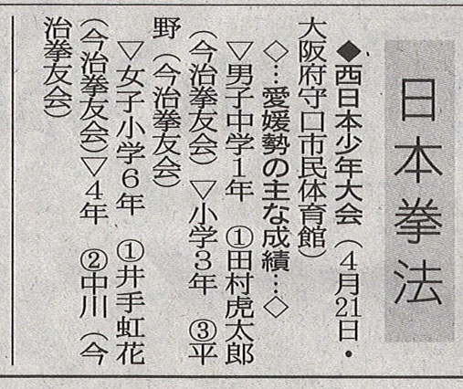 | 【中学1年男子】優 勝 田村 虎太郎 (二連覇 6回目) 【小学3年男子】優 勝 平野 生真 (初) 【小学6年女子】準優勝 井手 虹花 【中学2年女子】三 位 井出 七星 【小学5年女子】三 位 中川 はるか 【小学1年男子】三 位 大島 慶太 (その他の成績) 【小学1年女子】ベスト8 水本 芽依 部門:全・日本拳法少年個人選手権出場者 【西日本少年大会出場枠】各部門の入賞者(優勝、準優勝、3位) 1.中1男 田村虎太郎 今治 (7) 2.小6女 井手 虹花 今治 (5) 3.小5女 中川はるか 今治 (4) 4.小3男 平野 生真 今治 (3) 【四国大会優勝者出場枠】(各部門優勝者) 5.中2女 井出 七星 今治 (8) 6.小1女 水本 芽依 今治 (初) (※西日本大会重複) 中1男 田村虎太郎 今治 (7) 小6女 井手 虹花 今治 (5) 小5女 中川はるか 今治 (4) 小3男 平野 生真 今治 (3) 【愛媛県出場枠】 7.小1男 大島 慶太 今治 (初) 8.小5男 齊藤 俊彰 今治 (初) 部門:日本拳法高校個人選手権 【山口県出場枠】 1.澤村 優雅 (高2) 岩国 (初) 部門:日本拳法個人選手権 (成年男子) 【四国大会出場枠】 1.玉置 裕也 松山 (3) 2.岡田 郁輝 岩国 (初) 【愛媛県出場枠】(1名) 1.山中 涼我 岩国 (初) 棄権 |