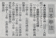 | 今治拳友会 【中学校1年生男子】優 勝 田村虎太郎 【小学校6年生女子】優 勝 井手 虹花 【小学校5年生女子】優 勝 中川はるか 【小学校3年生男子】優 勝 平野 生真 【小学校1年生女子】優 勝 水本 芽依 【中学校1・2年生女子】準優勝 井出 七星 その他の成績 【一般男子段外】廣間 成(ベスト8) 森下 真吾(ベスト16) |