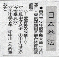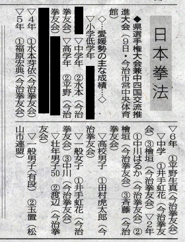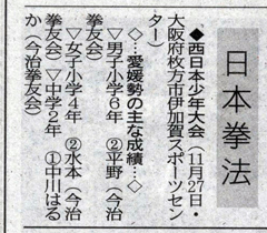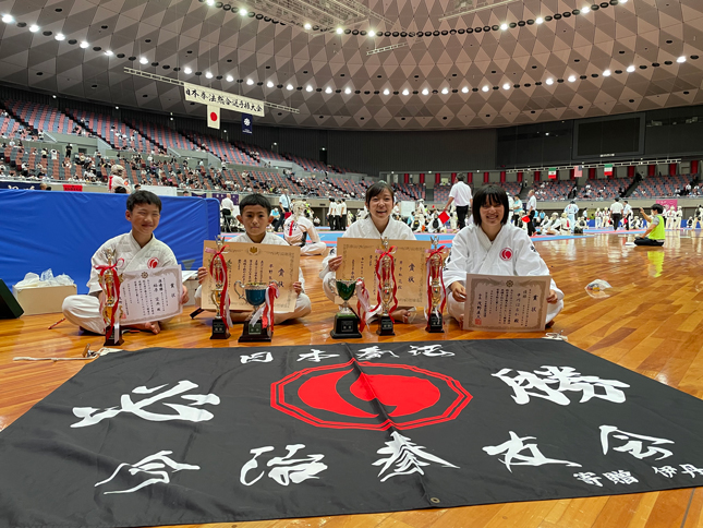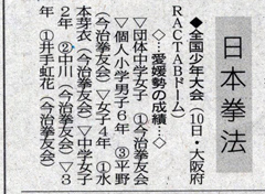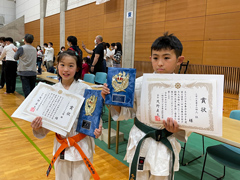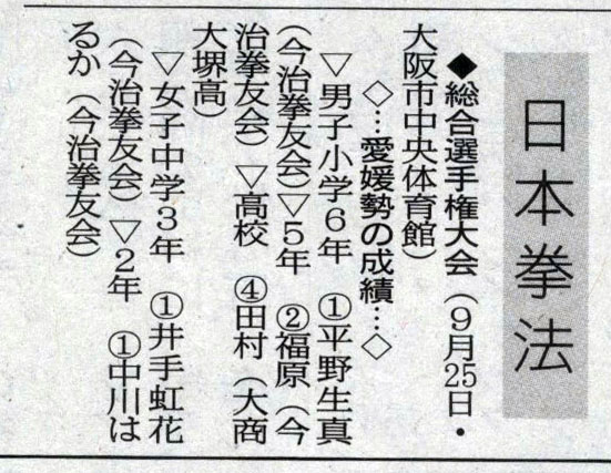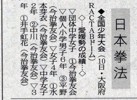 | (個人戦) 【中学3年女子】優 勝 井手 虹花 【中学2年女子】準優勝 中川はるか 【小学6年男子】三 位 平野 生真 【小学4年女子】優 勝 水本 芽依 (団体戦) 【中学生女子の部】優 勝 今治拳友会 (愛媛) 中学1年 不戦敗 中学2年 中川はるか 中学3年 井手 虹花 |
