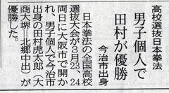 | 【一般女子】優 勝 中川はるか 【壮年】優 勝 渡邊 歩 【高校生女子】優 勝 中川はるか 【中学1年生男子】三 位 重松 大志 【小学6年生女子】優 勝 水本 芽依 【小学5年生男子】三 位 戴 福澤 【小学6年生】準優勝 水本 芽依 その他の成績 【一般男子有段】ベスト8 渡邊 歩 各部門の入賞者(優勝)は、9月に大阪で行われる全国大会の出場権を獲得。 但し、幼年、一般段外を除く。 |