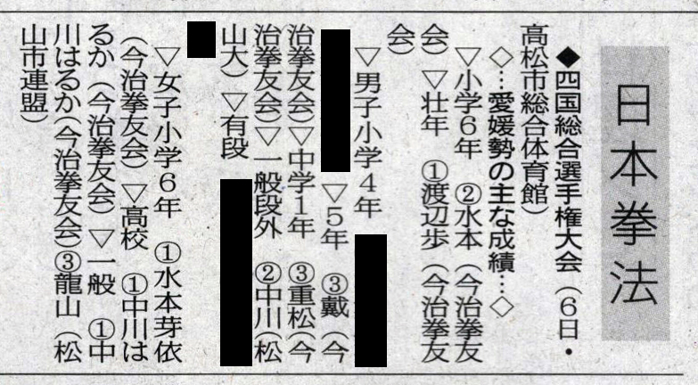 【小学6年女子】三位 水本 芽依 【高校生女子】準優勝 中川はるか(県立今治東中等教育学校) その他の成績 【小学5年男子】戴 福澤 ベスト16 |